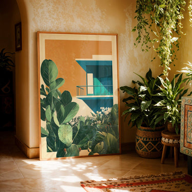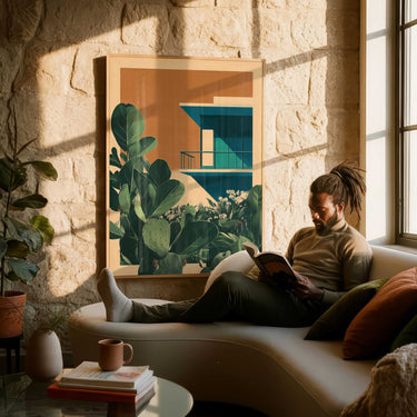 A seamless blend of nature and design, this piece captures the harmony between organic form and modern architecture. Bold geometry meets lush greenery, balancing structure with softness in a way that feels both grounded and visionary. With vibrant tones and crisp lines, it’s a study in how the natural and man-made can beautifully co-exist.