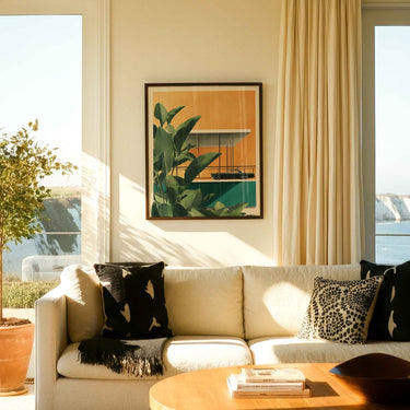 A seamless blend of nature and design, this piece captures the harmony between organic form and modern architecture. Bold geometry meets lush greenery, balancing structure with softness in a way that feels both grounded and visionary. With vibrant tones and crisp lines, it’s a study in how the natural and man-made can beautifully co-exist.