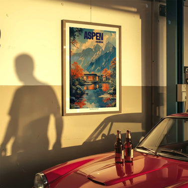 This Aspen, Colorado travel poster showcases a modern home surrounded by vibrant fall foliage with red leaves, reflecting perfectly in a serene lake. In the background, the snow-capped mountains create a stunning contrast with the autumn colors, capturing the beauty of the season. A perfect depiction of peaceful tranquility and the natural splendor of Aspen’s landscapes.