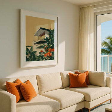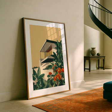 A seamless blend of nature and design, this piece captures the harmony between organic form and modern architecture. Bold geometry meets lush greenery, balancing structure with softness in a way that feels both grounded and visionary. With vibrant tones and crisp lines, it’s a study in how the natural and man-made can beautifully co-exist.