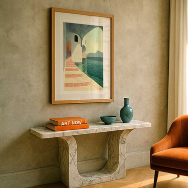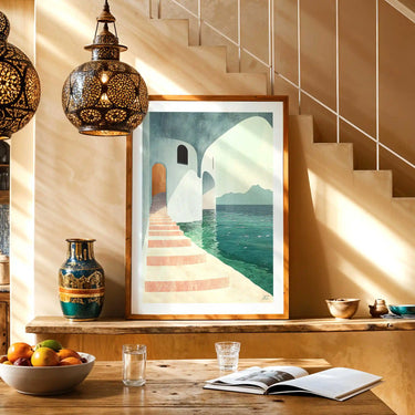 This artwork features steps leading toward a pristine white structure, nestled beside the clear green waters of the Mediterranean. With architecture framing the scene and mountains looming in the distance, the composition exudes a serene, idyllic atmosphere, perfect for evoking tranquility and escape.