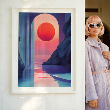This captivating artwork features a stunning red sunset, highlighted by a celestial eclipse, casting an ethereal glow over sleek architectural forms beside tranquil blue waters. The vivid contrast between the fiery sky and serene waters creates a mesmerizing, dreamlike ambiance, evoking mystery and wonder.