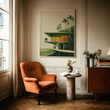 A seamless blend of nature and design, this piece captures the harmony between organic form and modern architecture. Bold geometry meets lush greenery, balancing structure with softness in a way that feels both grounded and visionary. With vibrant tones and crisp lines, it’s a study in how the natural and man-made can beautifully co-exist.
