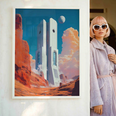 A towering futuristic structure stands against the backdrop of an alien desert, blending sleek design with the rugged beauty of a distant world. The contrast of warm red earth and cool industrial tones creates a visually striking scene of mystery and exploration.
