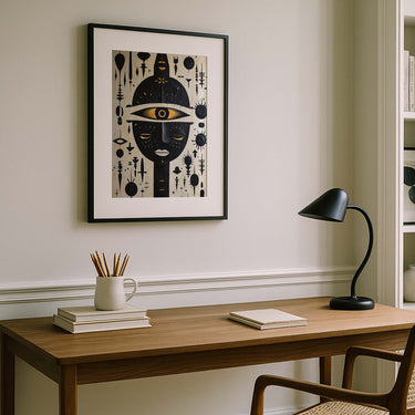 A bold, abstract piece of art that fuses a stylized face with tribal-inspired geometric shapes to create a sense of mysticism. The striking contrast of black and gold accents enhances its depth and richness, making it a powerful statement piece with a modern yet timeless appeal.