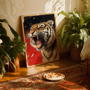 This striking print showcases a majestic tiger, its bared teeth and piercing gaze exuding strength and intensity against a bold red backdrop. Every intricate detail—from the sharp contours of its face to the flowing texture of its fur—captures the raw energy and untamed spirit of the wild. A commanding statement piece, this artwork brings power, passion, and fearless beauty to any space.