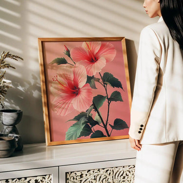 Two soft pink hibiscus flowers bloom delicately against a warm pink background, creating a harmonious and elegant composition. The gentle contrast between the lush petals and subtle tonal backdrop enhances the piece’s sense of serenity and natural beauty. Simple yet captivating, this artwork exudes a soft, dreamy charm that feels both timeless and refreshing.