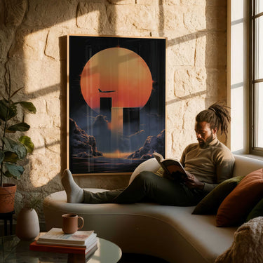 This piece of art captures a retro-futuristic dreamscape, where an airplane soars past towering monoliths beneath a glowing sunset. The calm waters mirror the sky’s radiant hues, amplifying the scene’s sense of wonder and scale. A bold fusion of nostalgia and futurism, this artwork evokes the beauty of exploration, possibility, and the unknown.