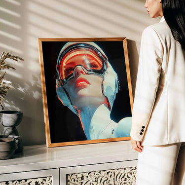 A striking blend of neon energy and futuristic aesthetics, this artwork brings a cybernetic woman to life with sleek, electrifying detail. The bold contrast of glowing hues and sharp design creates a sense of movement and intensity. Both captivating and modern, this piece adds a dynamic, high-tech edge to any space.