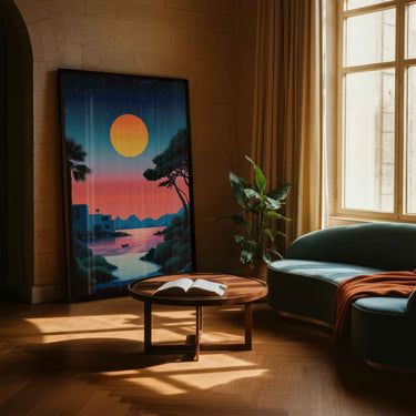 Bring warmth and tranquility to your space with this minimalist sunset landscape print, featuring a vibrant blend of orange, blue, and purple hues. Inspired by the serenity of tropical evenings, this artwork captures the sun’s gentle descent, casting a dreamy glow over a peaceful horizon. The smooth gradients and clean lines create an idyllic, modern aesthetic that enhances any space.