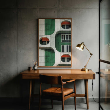 This architectural artwork explores the relationship between symmetry and repetition, bringing together structural precision with artistic expression. Subtle color contrasts and carefully placed windows invite the viewer to appreciate the balance of form and function.