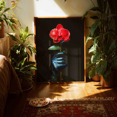 This bold, evocative piece of art captures a delicate red rose, gently held by a sleek, black-gloved hand, set against a striking blue backdrop. The contrast between soft petals and the smooth, shadowed grip creates a sense of elegance and quiet intensity. With its rich color palette and dramatic composition, this artwork feels both timeless and captivating, perfect for those drawn to refined beauty with a touch of intrigue.