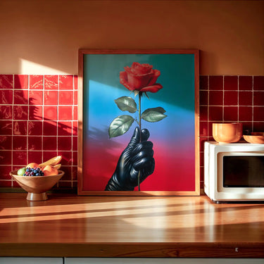 This piece of art features a black-gloved hand gently holding a deep red rose, set against a bold red and blue backdrop. The rich contrast between the dark glove, velvety petals, and vibrant background creates a striking balance of elegance and intensity. A captivating blend of drama and refinement, this composition draws the eye and leaves a lasting impression.