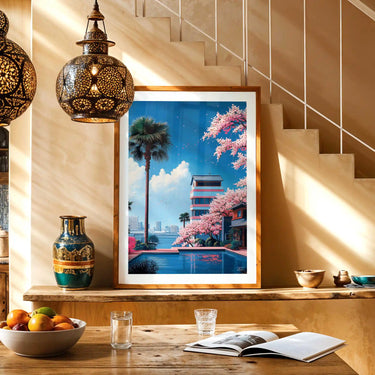 This artwork portrays an alternate reality of Japan, where modern architecture, palm trees, and sakura cherry blossoms blend together in a harmonious yet surreal landscape. Leaves float through the sky, adding to the dreamlike atmosphere of this beautiful juxtaposition of cultures and nature, creating a captivating and thought-provoking scene. Perfect for those who appreciate whimsical, nature-inspired art with a unique twist.