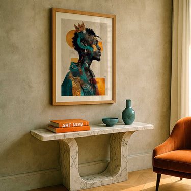 Rooted in Afrofuturism and cultural pride, this piece combines portraiture with bold abstraction to create a vision that feels at once grounded and otherworldly. Shapes, symbols, and color collide to reimagine identity as power, both timeless and forward-looking.