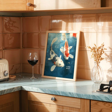 This vibrant illustration features two colorful koi fish swimming side by side, beautifully rendered in a traditional Japanese art style. The gentle movement of the fish, coupled with the serene water, captures the essence of unity and companionship. The quote "Wherever you're going, I'm going your way" adds a heartfelt touch, making this artwork a symbol of togetherness and loyalty. Perfect for those who appreciate meaningful, nature-inspired art with a personal connection.