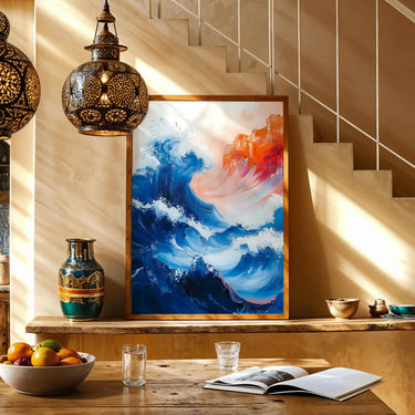 Deep blue waves surge toward the shore, where fiery orange cliffs rise up, their vivid colors clashing in an intense display of nature’s power. The expressive brushwork brings a sense of motion to the composition.