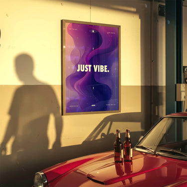 Against a backdrop of cosmic swirls and rich purple tones, the words "Just Vibe" take center stage, offering a quiet invitation to surrender to the moment. The artwork radiates a sense of ease and freedom, gently guiding you to follow your intuition.