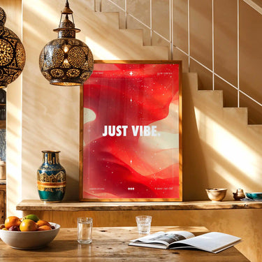 Against a backdrop of cosmic swirls and rich red tones, the words "Just Vibe" take center stage, offering a quiet invitation to surrender to the moment. The artwork radiates a sense of ease and freedom, gently guiding you to follow your intuition.
