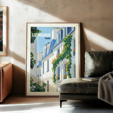 This Le Marais travel poster captures the charm of classic Parisian architecture, featuring white buildings draped in lush vines. The design offers a fun twist on timeless beauty, evoking the magic of a Paris summer. Perfect for those who dream of strolling through quaint Parisian streets and soaking in the elegance of the city’s timeless allure.