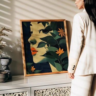 A captivating portrait of a woman framed by lush green leaves and vibrant orange flowers, this art print brings a sense of elegance and natural beauty to any room. Perfect for adding a touch of sophistication and calm to your space.