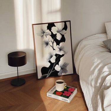 Bold, sweeping lines intertwine with delicate, detailed blossoms, creating a perfect balance between movement and stillness. This artwork captures the harmony of simplicity and intricacy, where each stroke adds depth and intention. Both expressive and refined, it makes a striking yet serene visual statement.