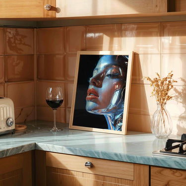 Elevate your space with this striking minimalist print featuring a sleek, chrome-like woman against a deep black background. The metallic sheen and smooth contours create a futuristic, almost sculptural elegance, making it a bold statement piece. Perfect for modern interiors, this artwork embodies sophistication, mystery, and the allure of minimalism.