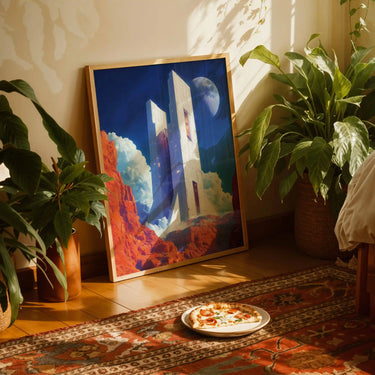 Set against the dramatic expanse of an alien desert, this piece of art depicts a monumental structure that hints at a distant future where humanity reaches beyond the stars. The play of warm earth tones and cool celestial hues creates a mesmerizing balance between nature and technology, evoking a sense of mystery and exploration.
