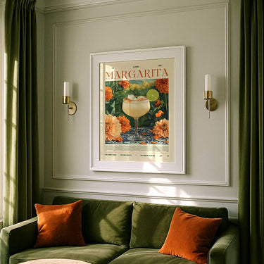 This vibrant illustration showcases a delicious-looking margarita, set against a colorful floral backdrop that bursts with energy. The fun, easy-to-read recipe adds a playful touch, making this piece perfect for those who love bright, whimsical art and cocktail culture. Ideal for adding a pop of color and personality to any kitchen or bar space.