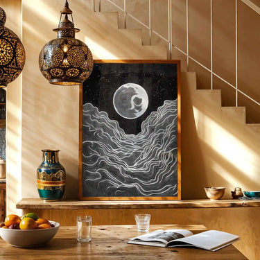 This enchanting print showcases the radiant glow of the moon, its surface subtly etched with celestial detail. Below, fluid white lines ripple like waves, creating a mesmerizing sense of movement beneath the starlit sky.