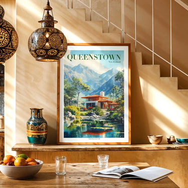 This Queenstown, New Zealand travel poster features a modern home surrounded by lush trees, with the crisp mountain air almost tangible. Set in the daytime, the scene captures the serenity of the mountains, offering a refreshing sense of escape and natural tranquility. Perfect for those who appreciate modern design and breathtaking landscapes.