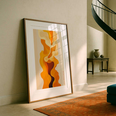 This abstract art print features the quote "Move with Purpose" set against a backdrop of bold black, yellow, and orange flowing forms, creating a sense of dynamic movement and focused energy. The fluid shapes and vibrant colors inspire a feeling of intentionality and strength, making this piece an impactful addition for those drawn to motivational art and powerful visual expression.