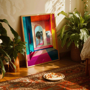 Vibrant hues of pink, blue, and orange intersect with bold architectural forms, creating a striking balance of structure and color. Sunlight filters through the arches, framing a serene tropical backdrop that adds a touch of escapism to any space.