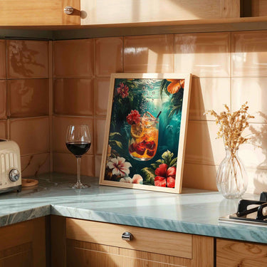 This vibrant and playful piece of art showcases a beautifully illustrated cocktail submerged underwater, surrounded by lush tropical flowers and set against the deep blue hues of the ocean. The mix of Hawaiian-inspired elements and bold, refreshing colors creates a sense of fun, relaxation, and island charm. Perfect for those who love tropical aesthetics and beach vibes this piece brings a touch of paradise and whimsy to any space.