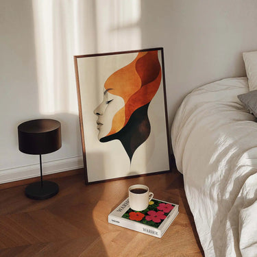 Soft, flowing forms in warm brown and orange hues shape this minimalist artwork, creating a profile that feels both serene and introspective. The gentle curves and earthy palette evoke a sense of calm and harmony, blending natural warmth with elegant simplicity. Both modern and timeless, this piece brings a quiet sophistication to contemporary and bohemian-inspired spaces.