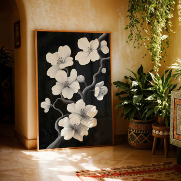 Delicate cherry blossoms bloom in bold, expressive lines, their intricate details standing out against a moody, monochromatic backdrop. This piece of art offers a modern take on nature’s elegance, where the contrast between light and shadow creates a sense of depth and quiet sophistication. A striking balance of serenity and bold design, it captures the beauty of simplicity.