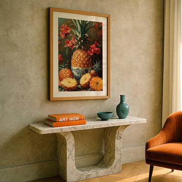 This beautiful still life art print features a pineapple seamlessly blended with white and blue ceramics, set against a backdrop of vibrant red flowers. The surreal composition combines elegance and whimsy, with the contrast between tropical fruit and delicate ceramics creating a striking visual balance. Perfect for those who appreciate unique, elegant art with a touch of surreal beauty.