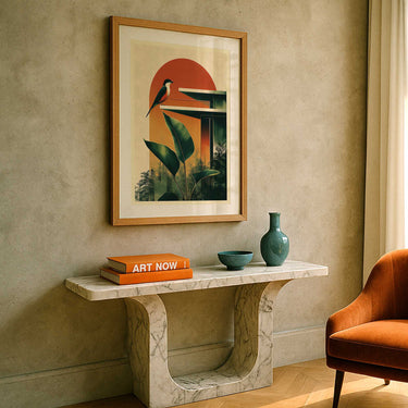 A seamless blend of nature and design, this piece captures the harmony between organic form and modern architecture. Bold geometry meets lush greenery, balancing structure with softness in a way that feels both grounded and visionary. With vibrant tones and crisp lines, it’s a study in how the natural and man-made can beautifully co-exist.