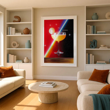This playful artwork features a cocktail set against a cosmic backdrop, with vibrant light leaks, stars, and a galaxy swirling in deep reds and blacks. A retro streak runs through the scene, adding a nostalgic touch. The cheeky quote, "Pour Decisions," brings a lighthearted spin to the theme of cocktails and indulgence, making it a fun and engaging addition to any space.