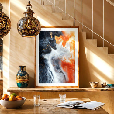 This abstract artwork features an elemental form, with bold strokes of orange, white, gold, and black that evoke a sense of ancient beauty. The piece feels prehistoric in its composition, with mesmerizing swirls and a rich color palette that captures the power and mystery of the natural world. Its striking textures and captivating design make it a unique statement piece, perfect for those who appreciate deep, evocative art.