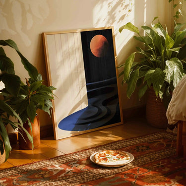 A soothing abstract print, where gentle curves of blue reflect the stillness of a serene landscape. The rich red planet contrasts beautifully against the deep black sky, while soft lines add depth and tranquility.