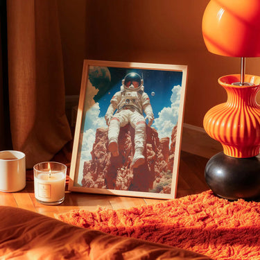 Under a vast, otherworldly sky, an astronaut stands atop a vivid red rock, taking in a surreal landscape of rolling deserts, drifting clouds, and distant planets. The fusion of cosmic wonder and earthly stillness creates a scene that feels both adventurous and introspective, drawing the viewer into an endless horizon of possibility.
