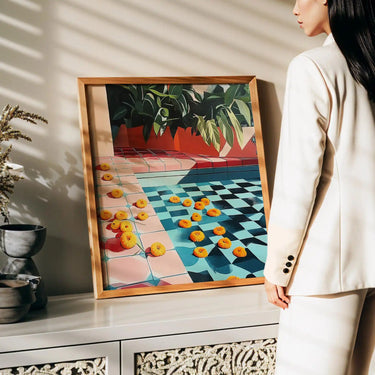 This vibrant artwork captures the beauty of orange flowers floating in a tiled pool, blending bold pop art aesthetics with the timeless charm of a Moroccan riad. The rich contrast between the warm floral tones and intricate geometric tiles creates a visually striking composition that feels both lively and elegant. Perfect for those who love modern design with a touch of exotic inspiration, this piece brings a sense of relaxation, culture, and bold artistic expression to any space.