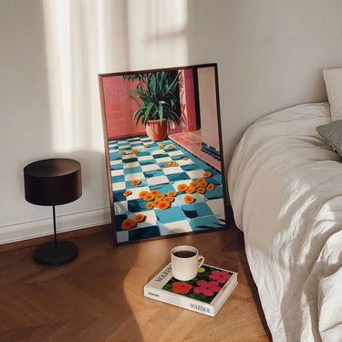 This bold and expressive piece merges vivid orange flowers with the intricate patterns of Moroccan tilework, creating a striking interplay of color and geometry. The pop art influence gives it a modern, graphic edge, while the ornate details evoke the rich textures of traditional riad design. Both vibrant and sophisticated, this artwork captures the spirit of timeless craftsmanship with a fresh, contemporary twist.
