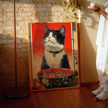 This traditional Japanese-style art print features a black and white cat sitting gracefully in front of a delicious bowl of ramen, set against a vibrant red and white background. The bold contrast and playful design capture the essence of Japanese culture and cuisine, blending simplicity with visual impact. Perfect for those who appreciate quirky, food-inspired art with a touch of traditional flair.