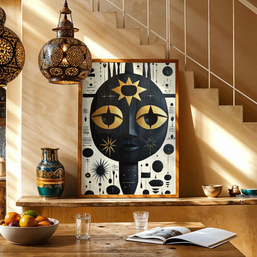This powerful artwork features a tribal-inspired face, surrounded by bold geometric patterns and symbolic markings that evoke a sense of mysticism and heritage. The striking contrast of black and gold enhances its intricate details, giving it a commanding, almost spiritual presence. Both raw and refined, this piece carries an air of ancestral wisdom and artistic strength, making it an unforgettable statement.