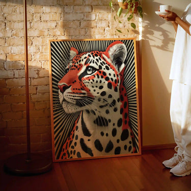 This expressive linocut-style print captures the fierce presence of a leopard, its piercing gaze accentuated by striking red stripes. The dynamic contrast of black, red, and beige adds depth and movement, bringing the raw power of the wild to life. A striking fusion of graphic intensity and untamed beauty, this piece is perfect for those drawn to bold, statement-making art.