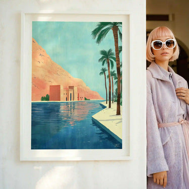 This idyllic artwork depicts a serene scene by the Nile, where orange, blue, and turquoise hues blend beautifully with the landscape. Palm trees line the scene, adding to the scenic tranquility and vibrant atmosphere. Perfect for those who appreciate nature-inspired art, this piece brings a sense of peaceful beauty and warmth to any space.