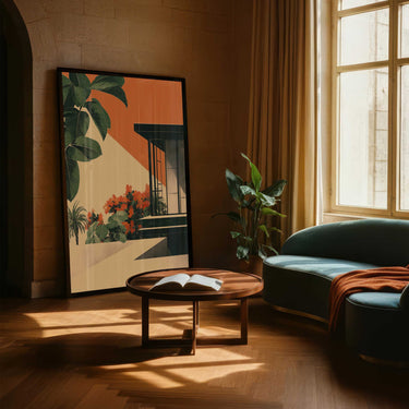 A seamless blend of nature and design, this piece captures the harmony between organic form and modern architecture. Bold geometry meets lush greenery, balancing structure with softness in a way that feels both grounded and visionary. With vibrant tones and crisp lines, it’s a study in how the natural and man-made can beautifully co-exist.