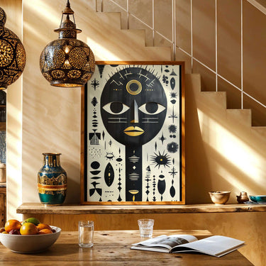 This bold artwork showcases a stylized face intertwined with symbolic patterns and precise geometric lines, creating a seamless blend of mysticism and modern design. The striking contrast of black and gold accents enhances its depth, drawing the eye to its intricate details. Both enigmatic and refined, this piece carries a sense of mystery and meaning, making it a compelling focal point in any space.